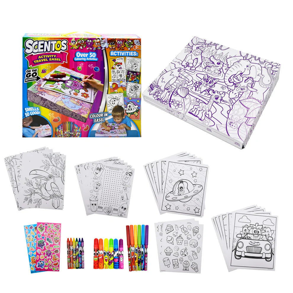 Scented activity fun. Includes colour in easel, 10 my first pictures, 10 colour by numbers pictures, 10 dot to dot colouring activities, 10 colouring activities, 5 velvet pictures, 2 scented sticker sheets, 6 scented fibre tip pens, 6 scented crayons, 6 scented markers . The markers and crayons are scented with fragrances like banana, apple, blueberry, orange and strawberry and are completely safe and non-toxic for use by children. Suitable for kids aged 3 years and above, Reclosable pack for easy storage and on the go fun.