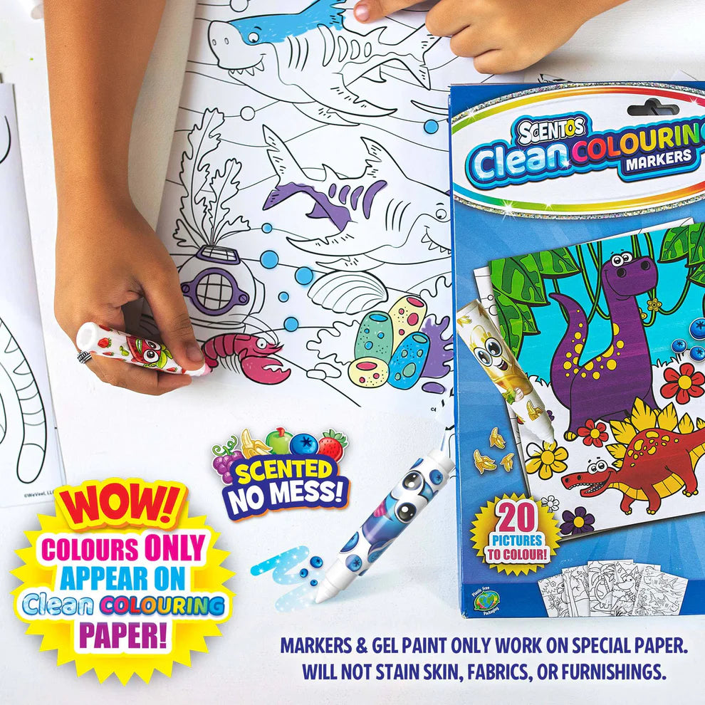 This Scentos Scented CleanColouring™ Adventure Set features 20 pictures to color, with our Scented Clean Colouring Markers with colors that only appear on Scentos CleanColouring™ Paper. No matter what coloring adventure your little artists might go on, parents can rest safe knowing that our CleanColouring™ markers only work on our special Scentos CleanColouring™ paper!