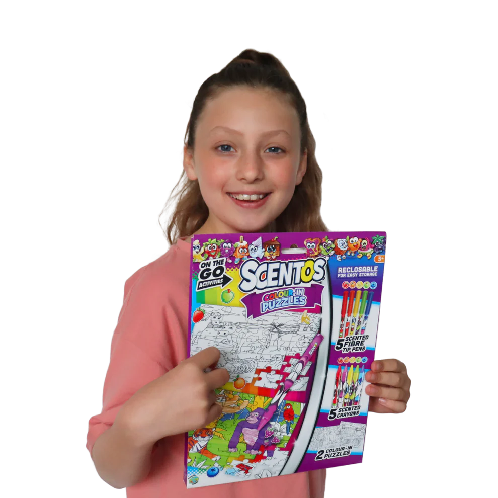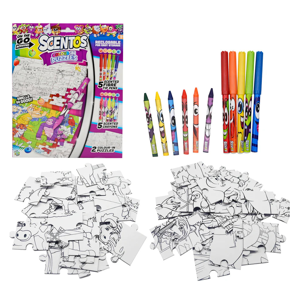 Scented activity fun. Colour in Puzzles. Includes 2 colour in puzzles, 5 scented fibre tip pens, 5 scented crayons The markers and crayons are scented with fragrances like banana, apple, blueberry, orange and strawberry and are completely safe and non-toxic for use by children. Suitable for kids aged 3 years and above, Reclosable pack for easy storage and on the go fun