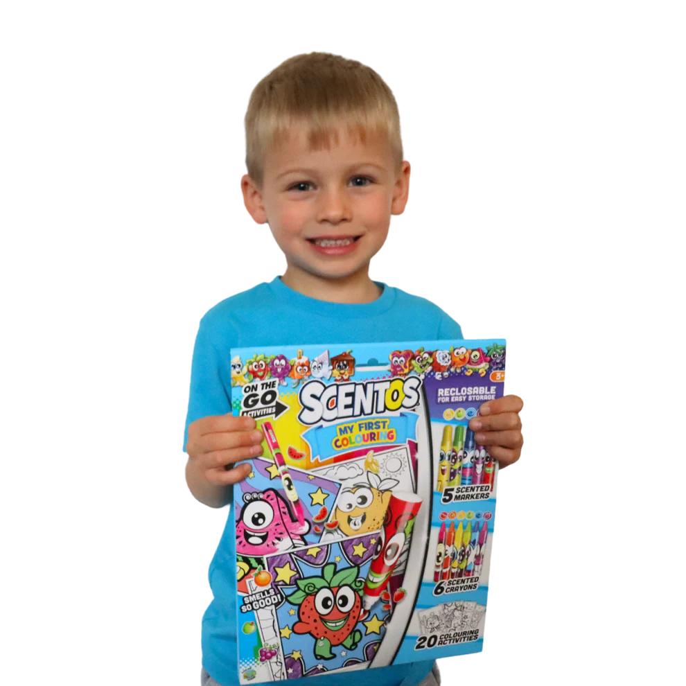 Scented activity fun. My First Colouring. Includes 20 colouring activities, 5 scented crayons, 5 scented markers, 5 scented crayons and 5 scented markers The markers and crayons are scented with fragrances like banana, apple, blueberry, orange and strawberry and are completely safe and non-toxic for use by children. Suitable for kids aged 3 years and above, Reclosable pack for easy storage and on the go fun.