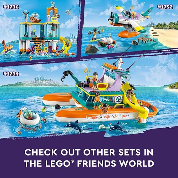 - Sea rescue play for kids ages 7+ – Kids who love the natural world of the ocean can imagine cleaning up the shores of Heartlake City as they build and play with this fun LEGO Friends Sea Rescue Boat set (41734)