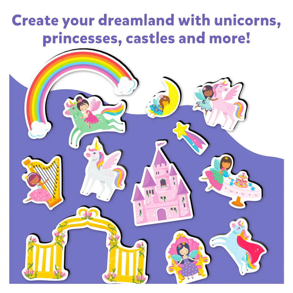 Introducing Magnetopia - Princess & Unicorn Land! Build your dream world, as many times as you like, with 9 large puzzle pieces to create the backdrop for magical fun. Then, add princesses, unicorns, castles, fountains, and more. With over ...