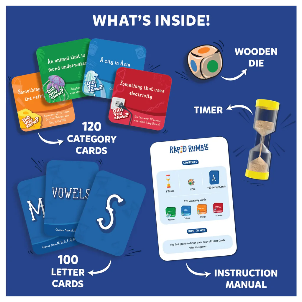 Rapid Rumble is the fastest, funniest and cleverest category game, and also one of the most exciting indoor board games! Our Rapid Rumble game for kids involves solving the riddles and getting rid of your letter cards for hours of laughter, lea...