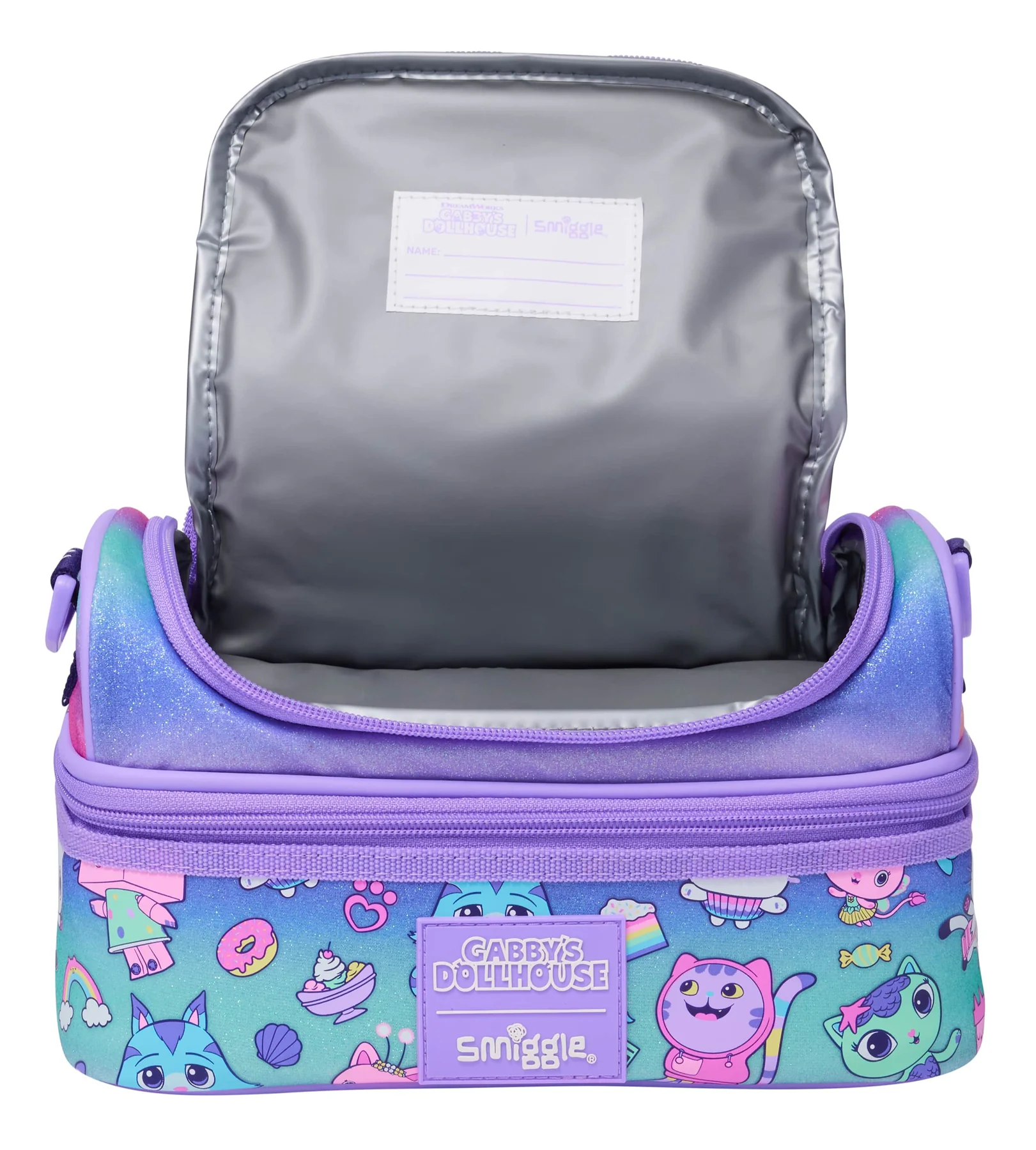 Carry snacks and meals in style with the Smiggle Gabby's Dollhouse Double Decker Lunch bag! With a spacious double-decker design and convenient strap, it's perfect for keeping food fresh and organized on-the-go. Perfect for all little ones who love the magic of Gabby's Dollhouse!