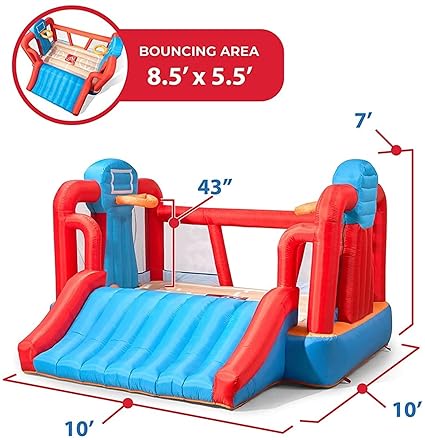 - In the box: Inflatable bouncer, extra heavy duty blower, basketball, ground stakes, storage bag, and repair kit.