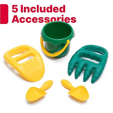 - Lid has molded-in roadways for added fun. Includes two shovels, two claw rakes and a bucket.
