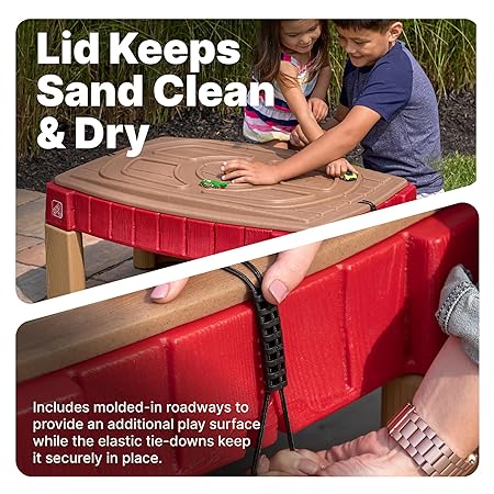 - Lid with elastic tie-downs protects sand from animals and pets.