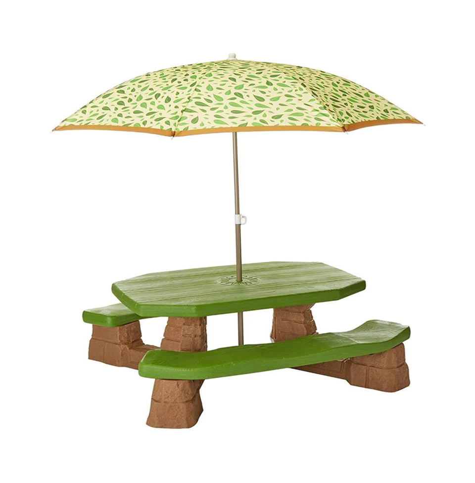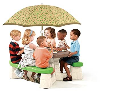 The Step2 Naturally Playful Picnic Table with Umbrella is a classic style with a pleasant design that fits into all types of backyards.Realistic sandstone and paver styled picnic table includes a removable 5 'wide umbrella. Wide contoured benches will seat six kids comfortably. Rugged molded plastic is easy to clean and resists fading. Great for picnics, games and projects.