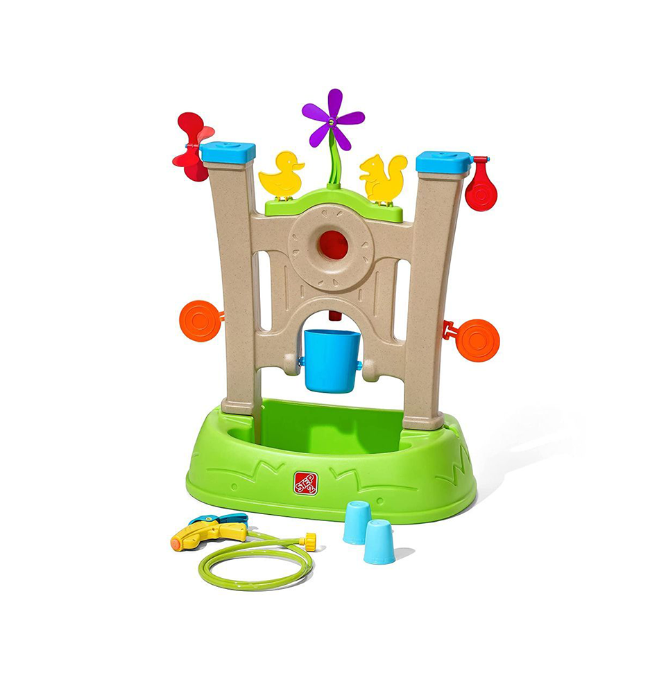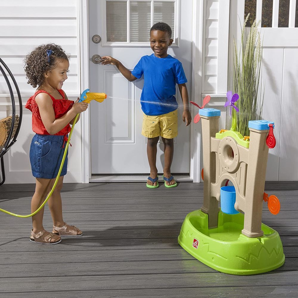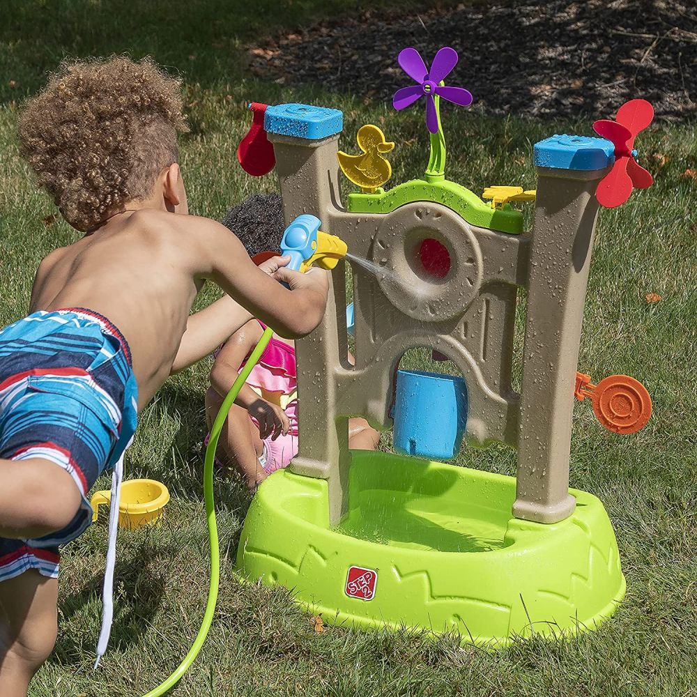 Bring exciting arcade-themed water play fun to your backyard with the Step2 Waterpark Arcade! Tons of kids’ water game targets are lined up and ready for little ones to splash them down with the water blaster, all secured with a large wall and wide base for extra stability. Easily attach the water blaster to a standard garden hose to get the water flowing and begin outside water game time! Little ones will practice their fine motor skills as they squeeze the trigger to use the water blaster to shoot water at each target, knocking them down and activating the spinners to create a big splash. Hit the center bullseye to fill up the spill bucket below – whoever makes the bucket spill into the basin is the winner! The water game for kids’ single-user style is a great way to teach little ones about sharing, patience, and even kindness by cheering friends on as they hit each target. Made in the USA of US and imported parts.