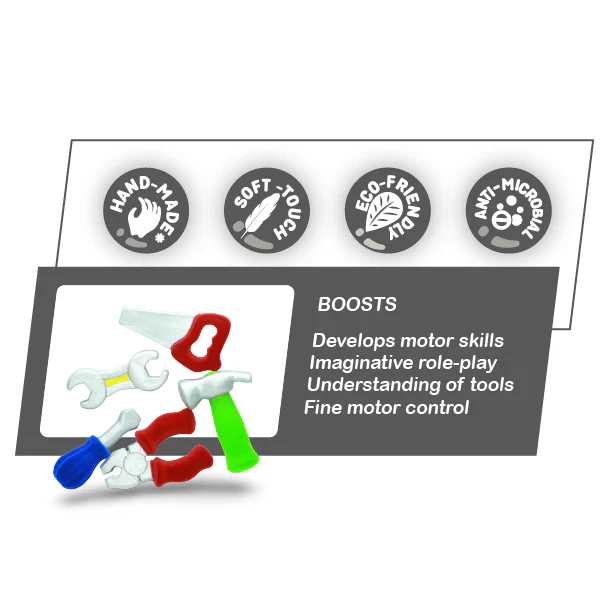 - TOOLS FOR ANY TASK: Includes screwdriver, hammer, wrench, pliers, and saw. The soft and squishy texture of the pieces makes them easy to grip and perfect for imaginative play. Your child can grasp, push, and move, enhancing their motor skills and creativity.
