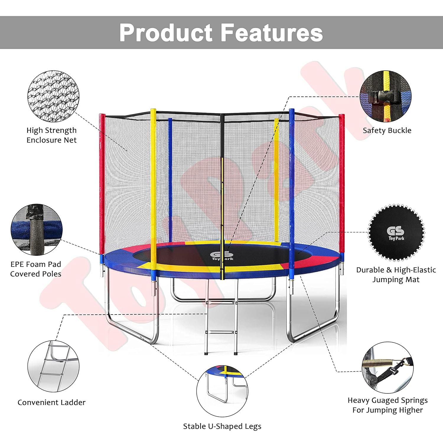 - Safety Enclosure Net and Foam Sleeves - The trampoline design increases the length of the zipper, making it easier for users to enter and exit, increasing the number of buckles for the zipper, and increasing the user's safety factor during use. The foam sleeve ensures that the child will hit the frame will not be injured.