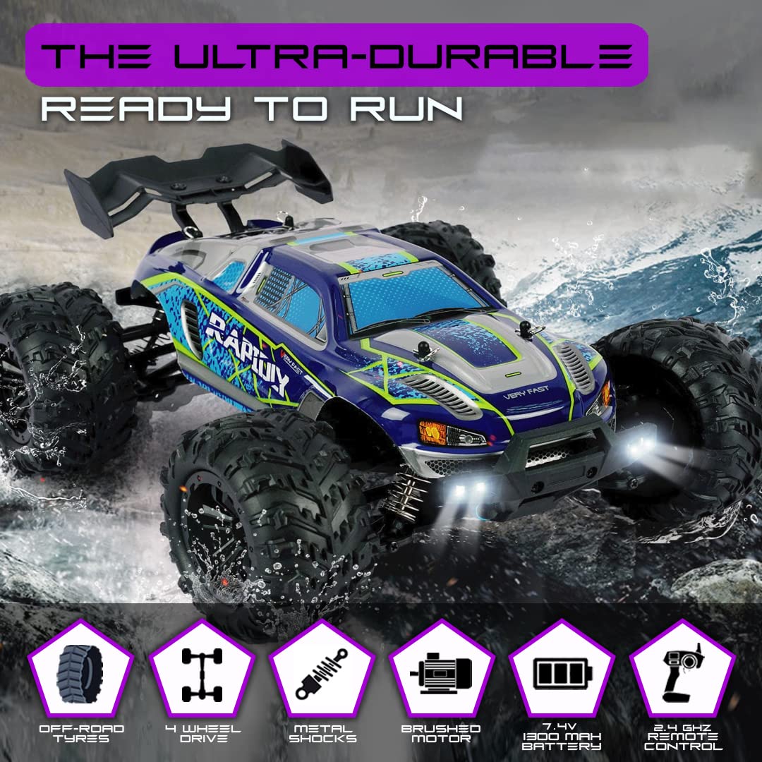 - Durable design that is splashproof and equipped with adjustable suspension and shock absorbers, all-terrain tires, and a long range transmitter and rechargable battery pack, it can handle off-road use and has a long run time( 20min) . Additionally, it comes with 2.4GHz radio control for responsive and stable steering, making it suitable for all skill levels.