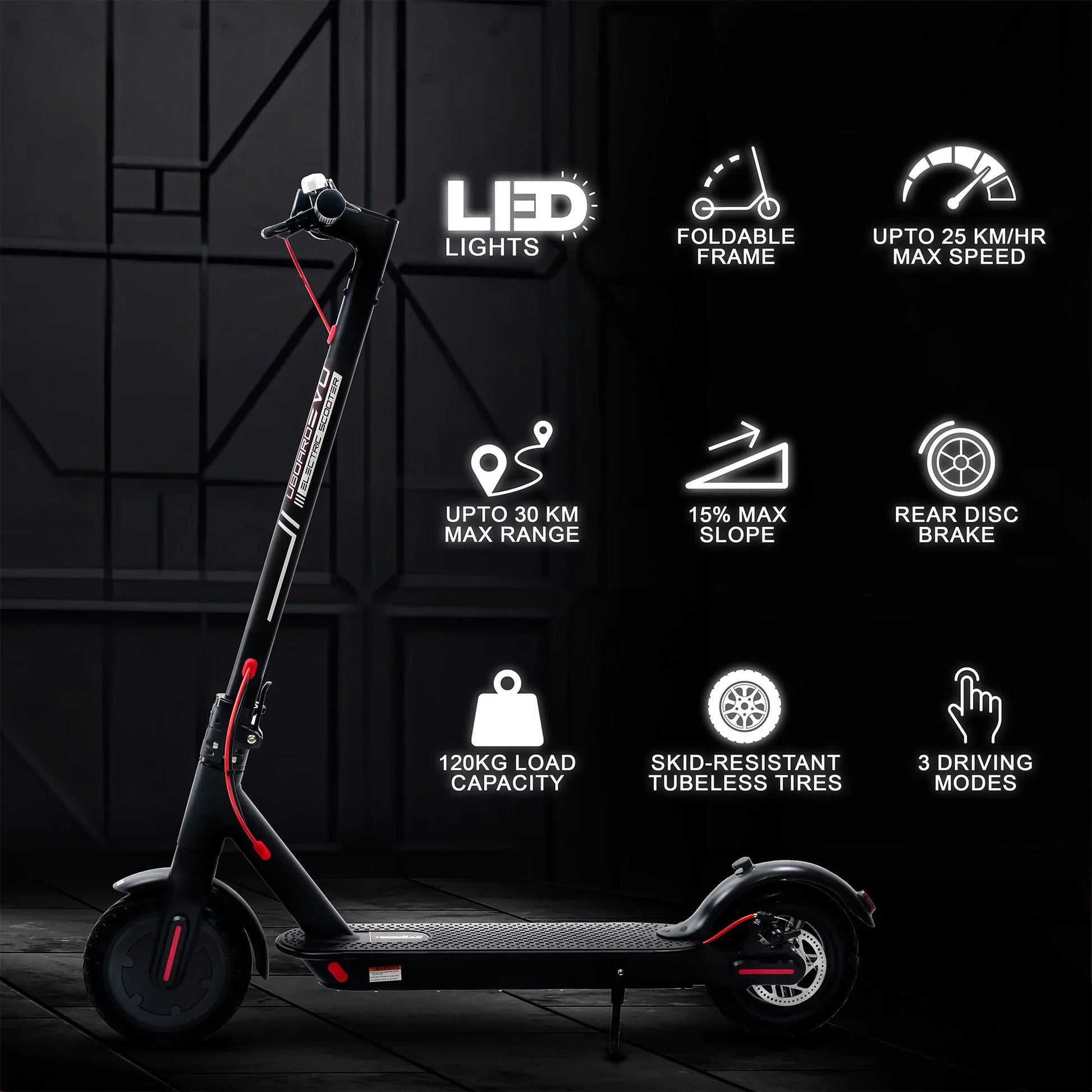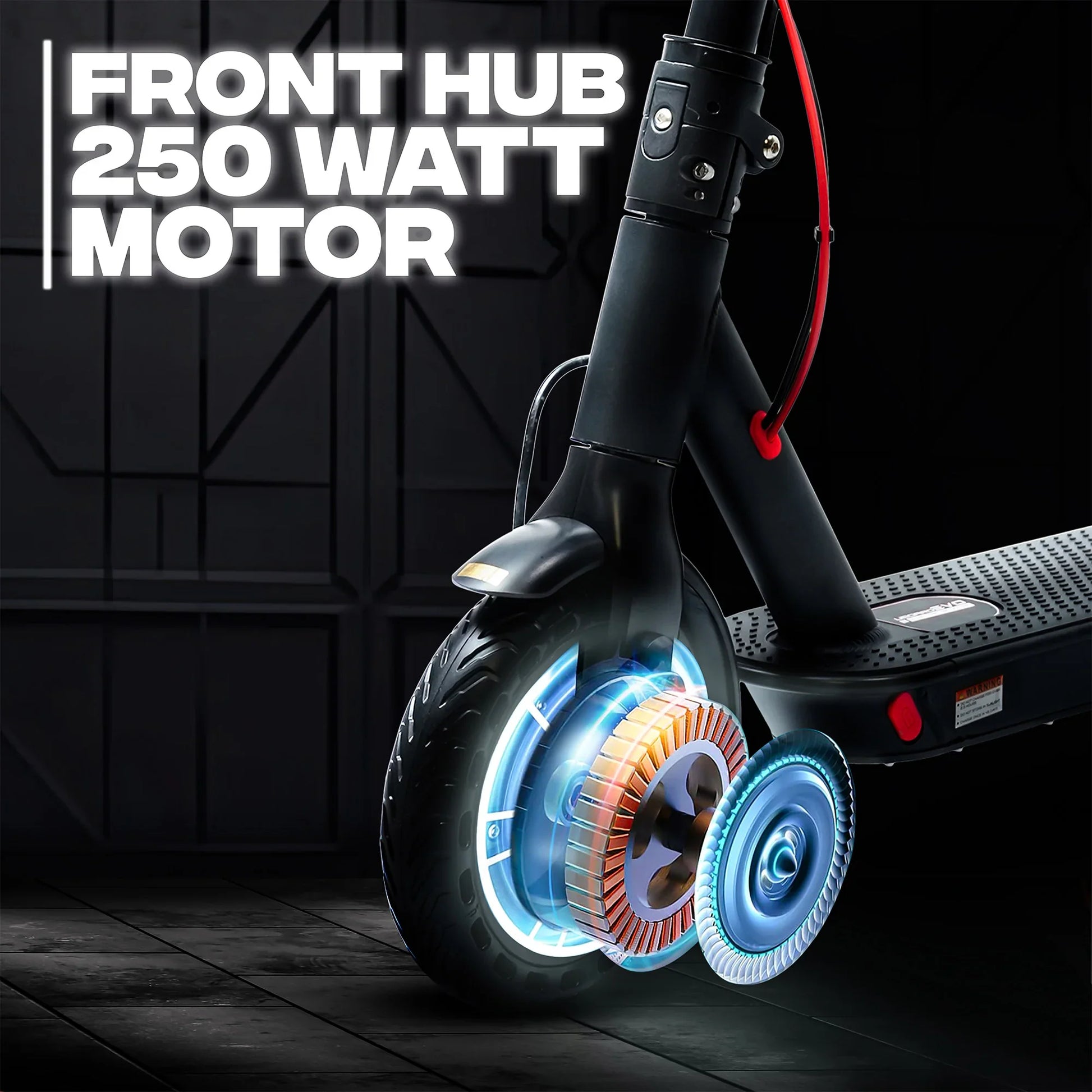 - EXTREMELY FAST AND LONG-RANGE BATTERY LIFE - A 250W motor propels the e-scooter to a max speed of 25 KM/h. High capacity battery with a maximum travel range of up to 30 KM under specific conditions.