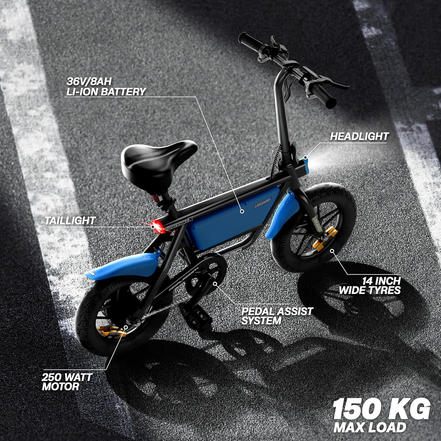 - DURABLE AND PRACTICAL BODY : Built with a rugged and reliable body, the Spacebike is designed to handle everyday commuting needs while being easy to carry and store. It can support a maximum load of up to 150 kg, making it suitable for a wide range of riders.