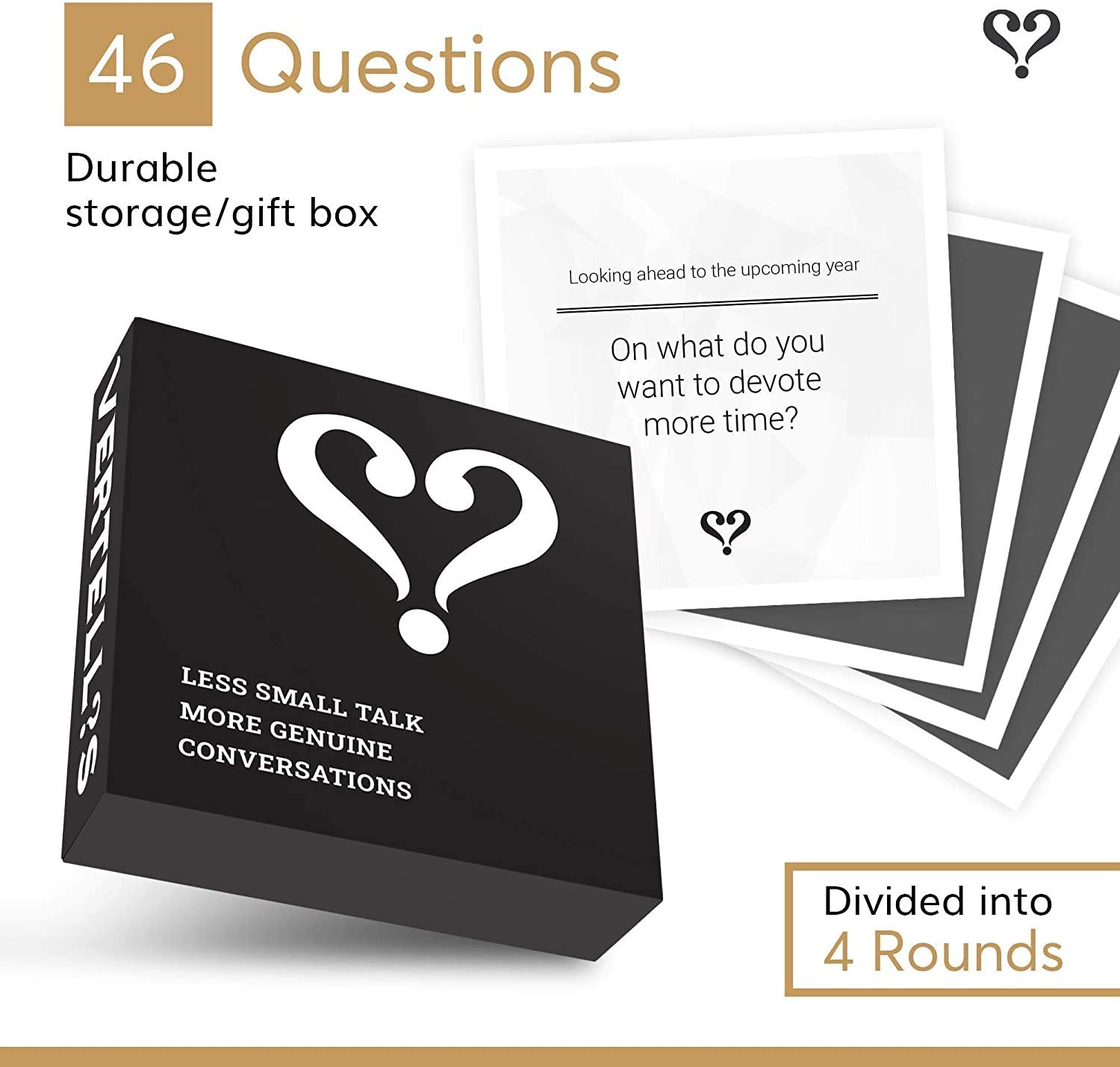 - ✅ UNIQUE DESIGN – This game is the brainchild of friends & family looking for deeper connections. No other card game looks like it. The deck is made up of 46 questions divided into four rounds, making for hours of fun question games.