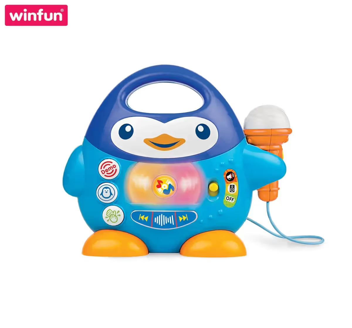 Music player with working microphone. Amusing echo effect.LED lights flash when music play. Catchy melodies and applause sound. Animal sound effects to mix in to the melody. Skip and reverse functions. Super sing along fun