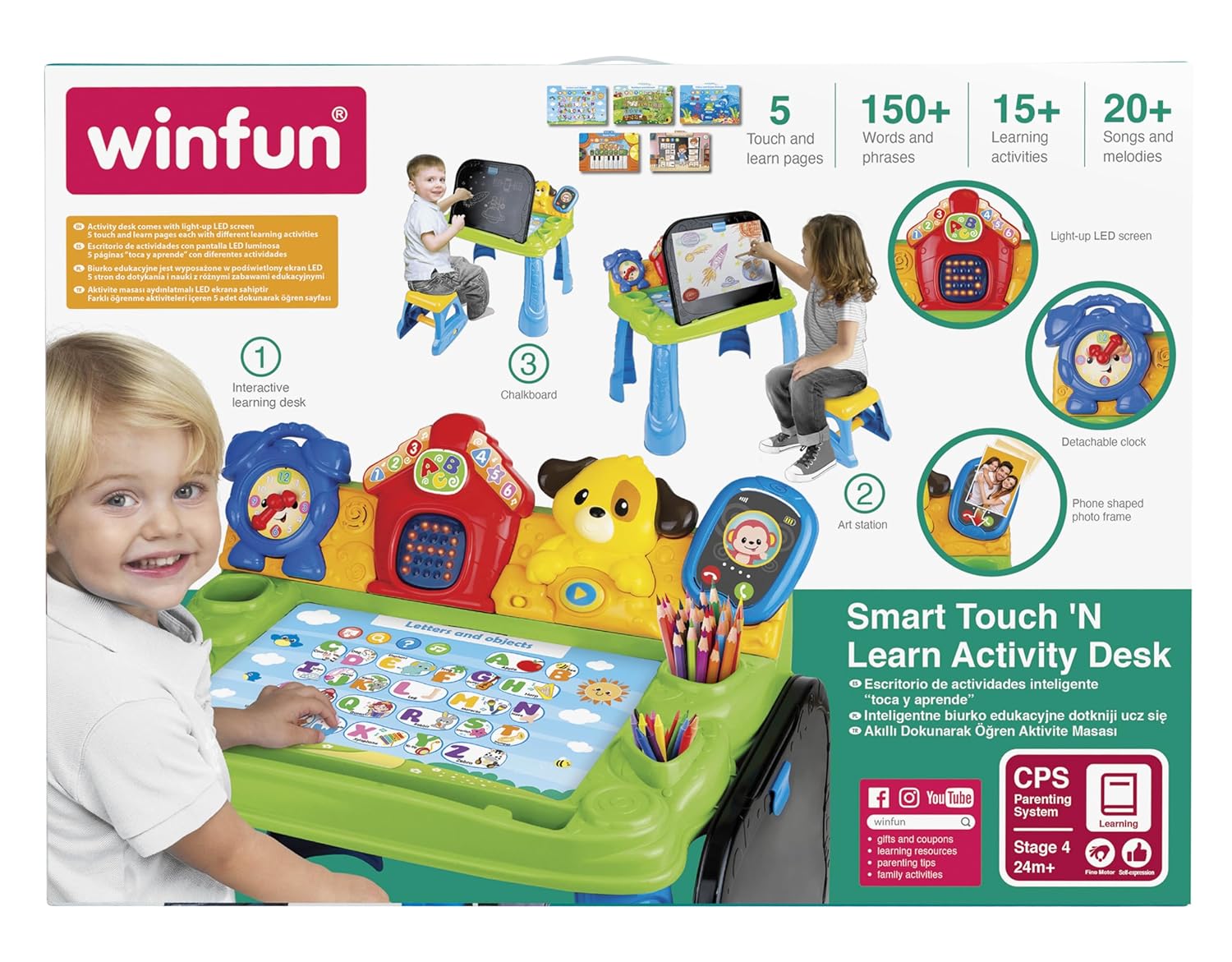 - Interactive Learning and Play: The Winfun Smart Touch 'N Learn Activity Desk is a versatile and engaging toy designed to captivate young minds through interactive play and learning. The desk features a colorful and vibrant design that includes various modes to introduce letters, numbers, shapes, and more. With touch-sensitive areas, children can explore and discover new concepts, making learning a fun and dynamic experience. The desk encourages independent play, helping children develop critical
