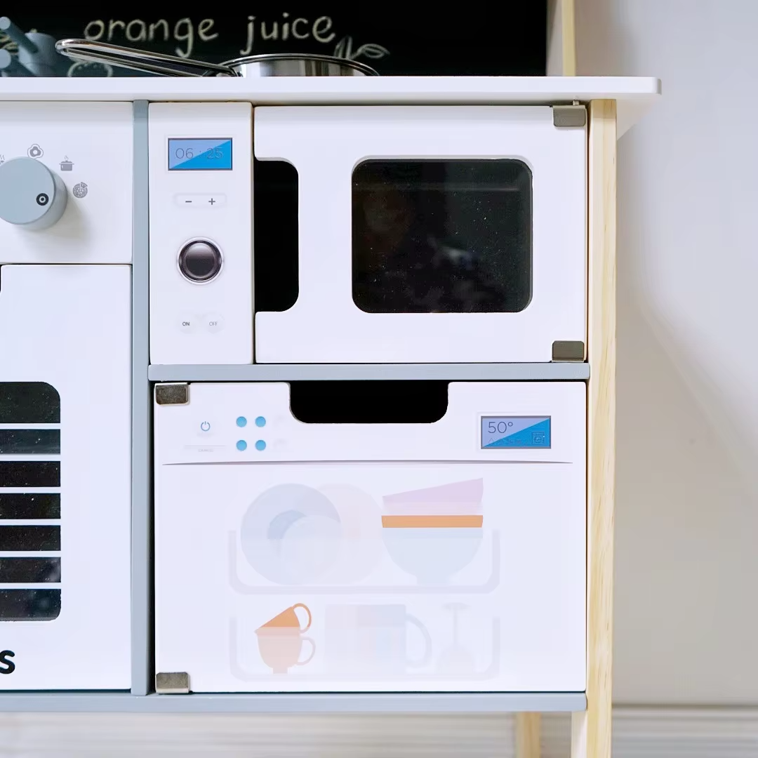 - FULL TOY KITCHEN SET: This fully equipped toy kitchen set will keep kids busy for hours, day after day. The realistic playset has doors that open and close, knobs that turn and click, and sights and sounds just like a real kitchen.