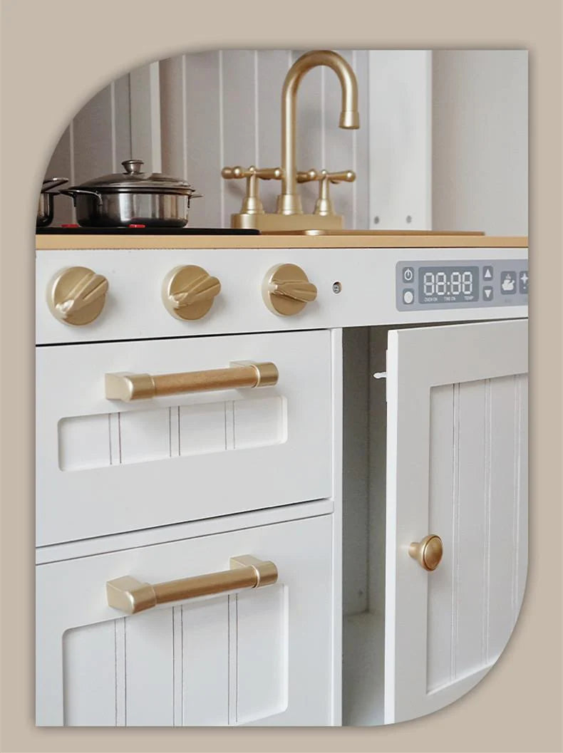 - FULL TOY KITCHEN SET: This fully equipped toy kitchen set will keep kids busy for hours, day after day. The realistic playset has doors that open and close, knobs that turn and click, and sights and sounds just like a real kitchen.