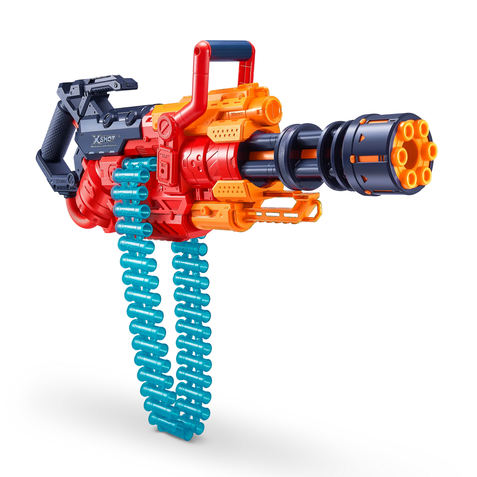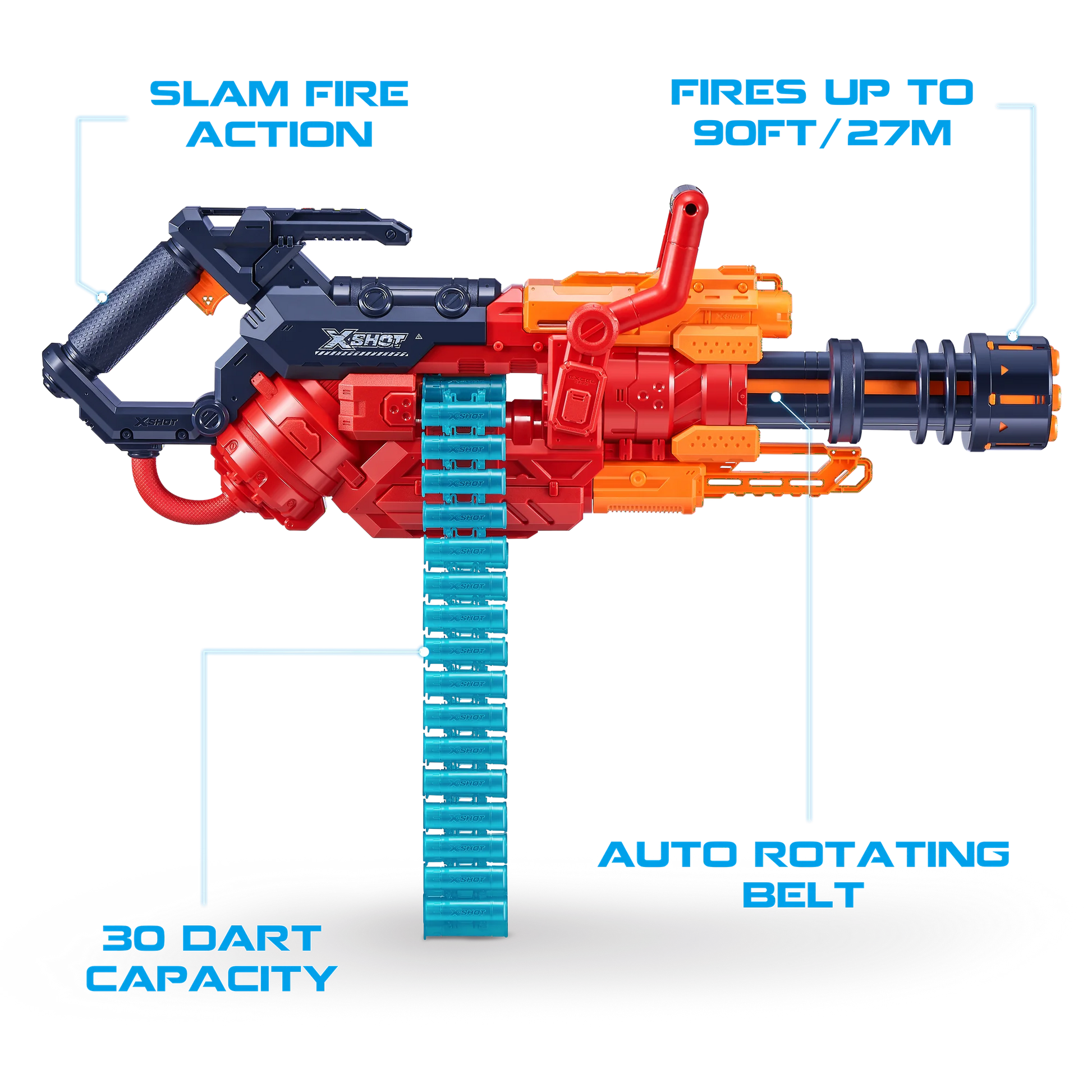 - Belt Fed Blaster: The X-Shot Excel Crusher has a 35 dart capacity belt that feeds into, and automatically rotates through, the blaster.